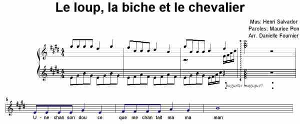 ni même quand il se manifestera. Le Loup, la biche et le chevalier Le loup, la biche et le chevalier est une petite chanson enfantine dans le sens où elle nous rappelle les berceuses et contes de notre enfance.L'introduction se fera fort simple (deux voix). Je la place dans un registre aigu (boîte à musique, petit mobile musical). J’ai emprunté sa structure harmonique au début de la chanson. Dans la main droite, toutefois, les notes de la première mesure ont été inversées (comparé à la mesure 5), alors que celles de la seconde mesure préservent l'harmonie, le rythme et les notes répétées, mais d'une façon plus libre. ![]() Pour terminer, un trait d’arpège en doubles croches viendra créer une atmosphère d'enchantement—comme s'il s'agissait d'une envolée de la harpe ou d'un coup de baguette magique.