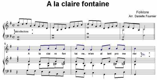 A la claire fontaine Voilà une chanson bien connue! Pourtant, il n'est pas si facile de l'introduire… Pour ma part, j'ai songé au texte de la chanson et à la vague tristesse de l'amoureux que l'on surprend ici à rêver dans l'eau claire de la fontaine. Il n'en fallait pas plus. Plutôt que de créer une musique parallèle à partir des notes de la mélodie ou d'une quelconque propriété du rythme comme point de départ, j'ai tenté de recréer l'atmosphère de la pièce. Cela commence avec le mouvement de l'eau dans la fontaine (flot du rythme continu). Lorsqu'il s'immobilise à la mesure 4, on découvre alors à la surface de la fontaine l'image de celle dont rêve notre amoureux. border=0>Pour respecter le caractère intimiste de la chanson, le piano—auparavant, eau de la fontaine—se fait ensuite miroir des sentiments du jeune homme, se promenant au même rythme que celui-ci (i.e. style choral).