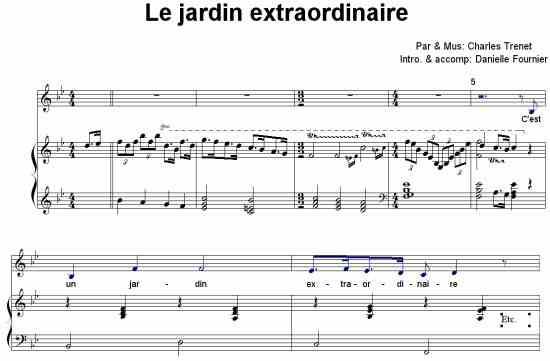 Le jardin extraordinaire Avec un titre comme celui-ci, il faut bien une introduction qui donnera le goût de le visiter. Ainsi font, font, font, cinq petites mesures, pour faire un tour rapide du jardin. D'abord, un petit tap dance monsieur Trenet (mesure 1)? Et que dire d'une gentille gambade sur la colline (mesure 2)? Faisons ensuite un court arrêt pour écouter les oiseaux (trilles). Et enchaînons avec un petit tour de balançoire à la mesure 4. Et puis, ça y est — on est déjà transporté dans l'atmosphère du jardin, avant même que la chanson n'ait commencé. ![]() Ensuite, c'est le chant qui veut se faire entendre. Le piano acquiesce en se faisant plus discret, se manifestant un peu plus ici ou là pour ponctuer un mot, ou encore pour esquisser un petit clin d'oeil—profitant de ce que la chorale chante des notes longues. A l'inverse, lorsque la mélodie du choeur comporte des notes rapides, le piano peut la soutenir avec des notes de valeur longue, ou espacées. A l'occasion, il peut également amplifier un tel passage en le doublant à l'unisson (ou/et en rythme).