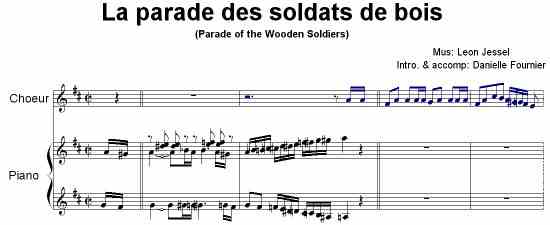 La parade des soldats de bois Rythme de tambour, parade de soldats: vivement, interpelons l'auditeur avec une introduction qui le mènera tout droit à … la chorale! Pour surprenante qu'elle soit, cette introduction est basée sur un accord de V7 renversé, remis à l'endroit sur la denière note. Le rythme, semblable à celui de la chanson, développe toutefois ses traits de double-croches plus tôt. La dissonance s'installe dès les premières notes, avec une écriture chromatique très serrée, dont les mouvements parallèles évoquent le battement des tambours. Puis, les deux mains s'éloignent par des mouvements contraires, dans une ouverture qui aboutit à l'octave. Fin de la dissonance, la chorale commence! ![]() La mélodie du choeur s'enchaîne alors, pimpante comme du pop-corn, comme nous le rapellent les petites croches aux accents syncopés qui donnent à la première mesure toute son énergie.