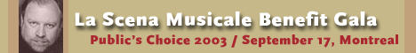 The readers of La Scena Musicale have made their choice! The programme of the 2nd La Scena Musicale Benefit Gala Concert at the Pollack Hall, September 17th, 2003 at 7.30 p.m. contains two songs by Sergei Rachmaninoff as well as popular operatic arias in three languages (Italian, French and German) including Puccini's "Nessun dorma." An editor's choice of three duets rounds out the programme. Our performers this year are John Mac Master (tenor), Annamaria Popescu (mezzo) and Mirela Tafaj (soprano) accompanied by pianist Michael McMahon.